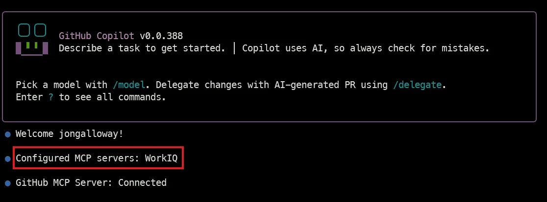 Restart the CLI, and you’ll see the Work IQ MCP server there!